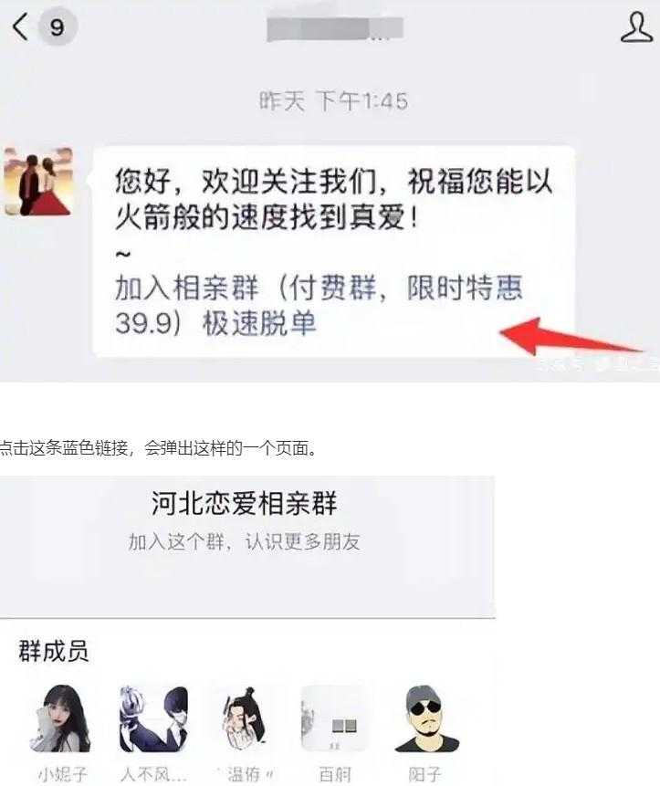 项目的核心就是通过抖音发相亲群的聊天记录作品,吸引用户到公众号,引导用户付费,进群的门槛是29.9,支付后获得进群资格。