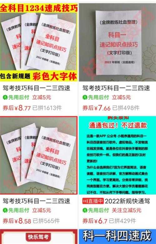 一个万能的方法,去某多、某宝搜索一下你就知道了。主要搜索关键词为“考驾照”,出来的结果是考驾照的题目资料。