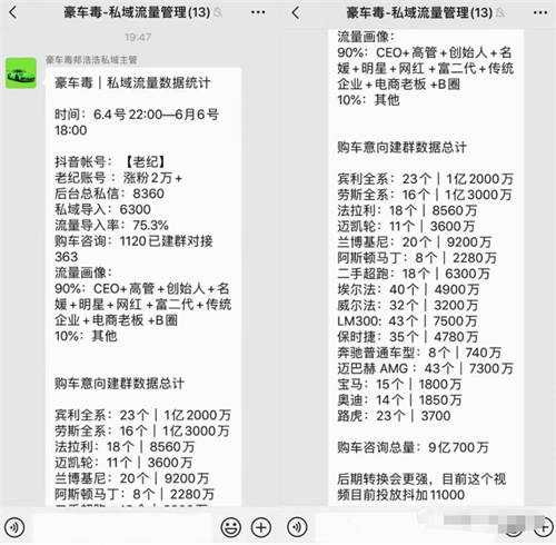 就这样两条视频,让老纪一天时间精准涨粉2万,后台私信8360条,导入私域6300人,流量导入率75.3%。而且你要知道,他们现在的私信还在不断的增加。他们目前已经建了1120个购车意向咨询对接群,其中90%的流量都是来自CEO+高管+创始人+名媛+明星+网红+富二代+传统企业+电商老板+B圈。这就么2天时间已经成交了一个多亿的豪车,还有9个亿的意向成交正在路上。