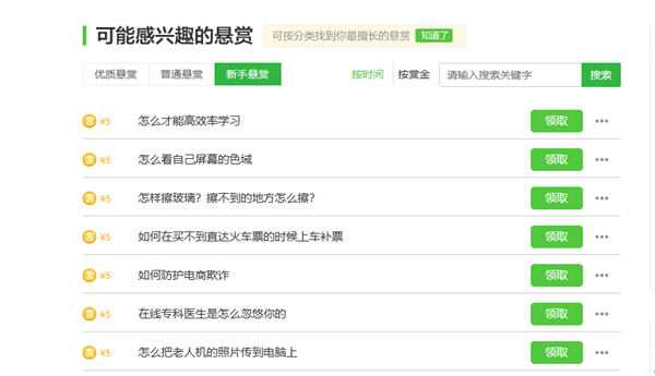 打开后,下滑一下基本就可以看到我们的悬赏专栏了,选问题的时候,首先记得点击新手悬赏,新手悬赏给出来的佣金是非常可观的,建议先参与一下。