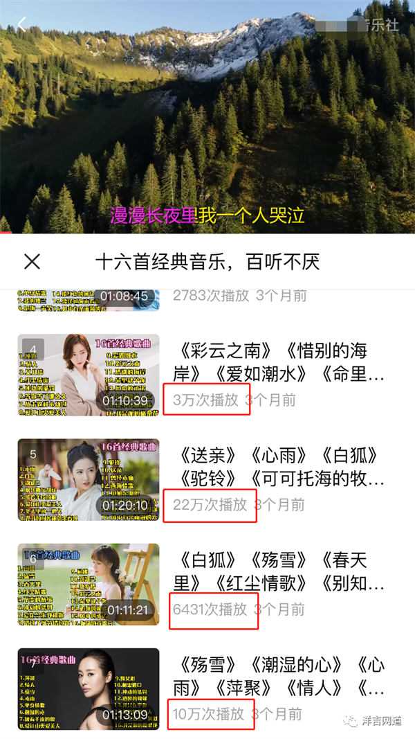 我观察了好几个同类视频的作者,发现其制作的视频都没有多大的技术含量,根本就不要什么专业知识,更不需要多高的学历,诱人的封面美女+DVD光碟设计感,简单的风景视频配上统一的字幕加音乐就可以了(有点像KTV风格),主要吸引的人群是中年群体,下图