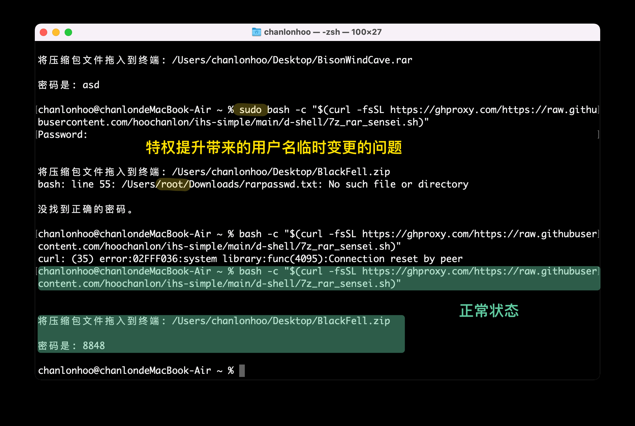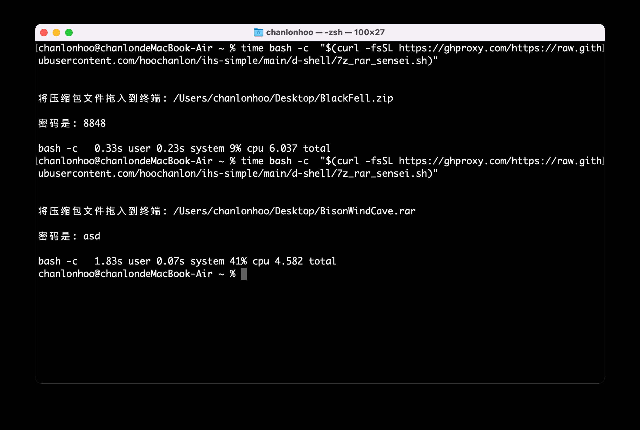 brew install p7zip > /dev/null 2>&1运行效率较低,也算是个无心之举。跑代码测试的时候,我发现这种写法,明显感觉比if慢好多,所以就pass掉了。在Mac上,7z并不支持验证rar压缩包密码;Mac下面的rar,也不支持zip的密码验证。这个是p7zip与rar(两者都是 brew 安装)的实验结论。