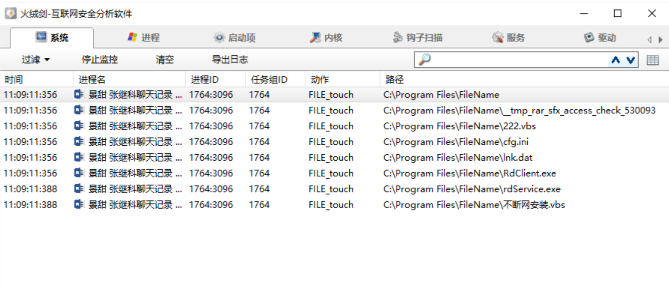 一、详细分析病毒文件“景甜张继科聊天记录 曝光.exe”运行之后,会将RdViewer远控软件释放到C:\Program Files\FileName目录下,火绒剑监控到的行为,如下图所示: