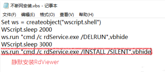 通过执行不断网安装.vbs脚本来静默安装RdViewer,相关脚本,如下图所示: