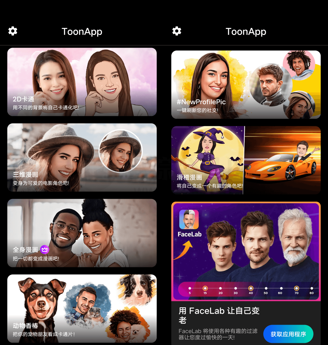 拥有2D卡通、三维漫画、全身漫画、动物香椿、滑稽漫画等效果滤镜,可以将任何照片变成时尚的卡通风格或者动画人物,供我们任意选择。