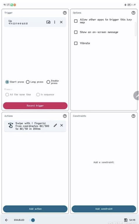2、点击Record trigger按钮,然后在蓝牙遥控器上按下你要映射的按键,Trigger页面记录上按键后,再点击下面的Add action按钮,选择要映射的功能,我想映射的是向上滑动屏幕,选择的是Swipe Screen,设置如下图最右边那张图,把滑动起点和终点位置输入好点击那个 勾勾 保存就OK了。